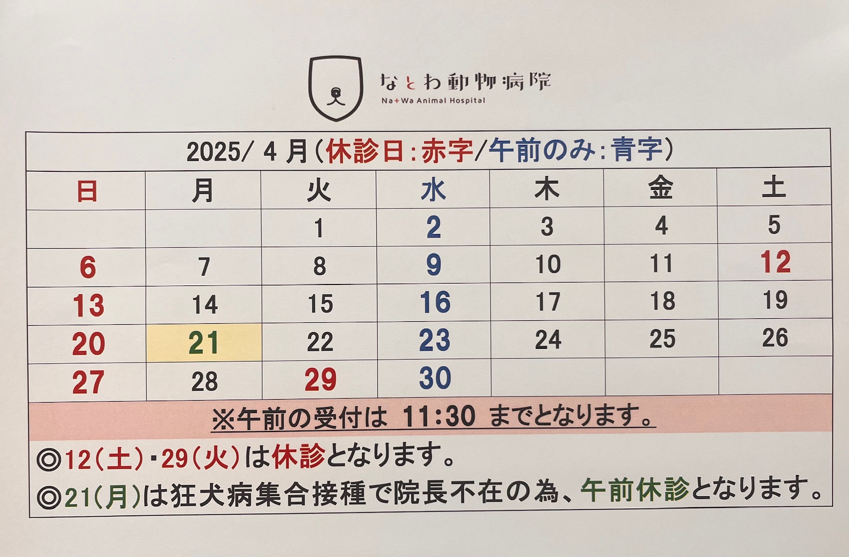 20253.27 4月の休診日のお知らせ カテゴリ[ 休診日 ] 毎週日曜日と祝日・水曜日の午後が休診日となっております。 4/21(月)は狂犬病集合注射のため午後のみの診察となっております。 4/12(土)は院長不在のため休診となっております。 手術件数が増えており、手術時間内(12:00〜16:00)に手術を実施する事が難しい場合があります。そのため午前中の11:30以降の受付が、手術予定状況、外来混雑状況によってはお受け出来ない場合もございます。午前の診察にお越しの際は11:30までにお越し頂くようお願いいたします。