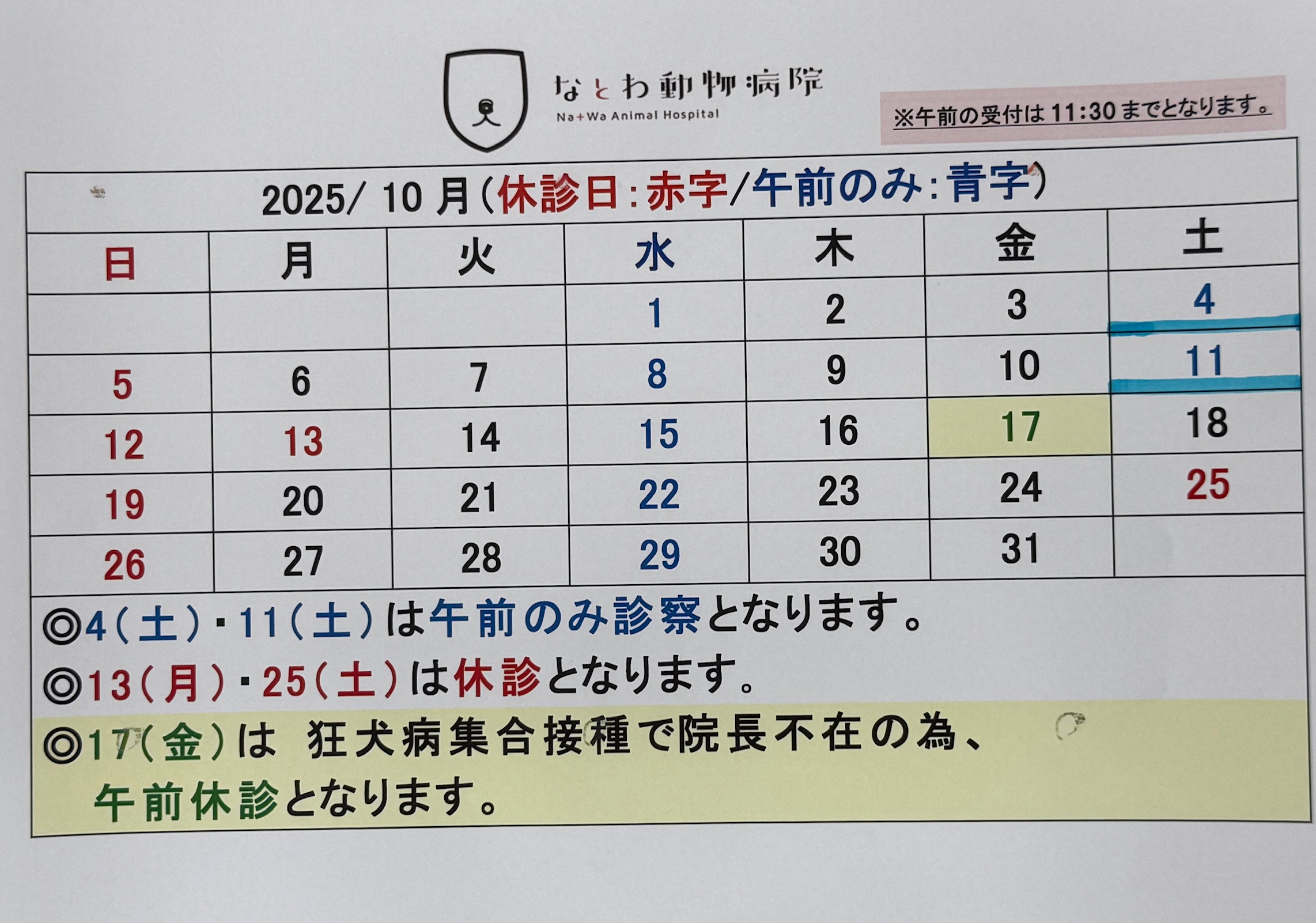 10/17(金)は狂犬病集合注射のため午後のみの診察となります。