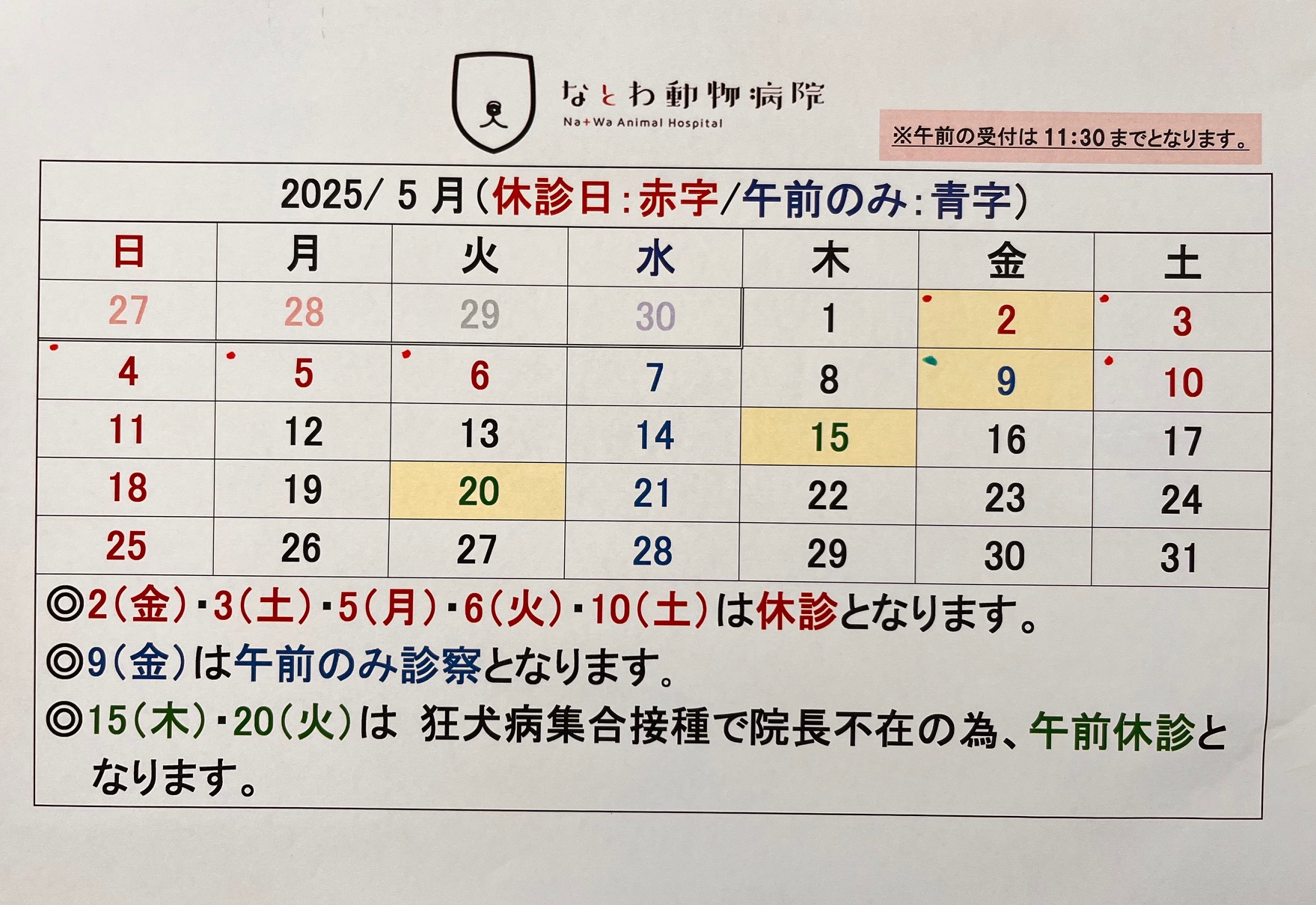 5月はゴールデンウィークならびに狂犬病集合注射のため不規則な診療日となっております。ご迷惑をおかけしますが何卒よろしくお願いいたします。