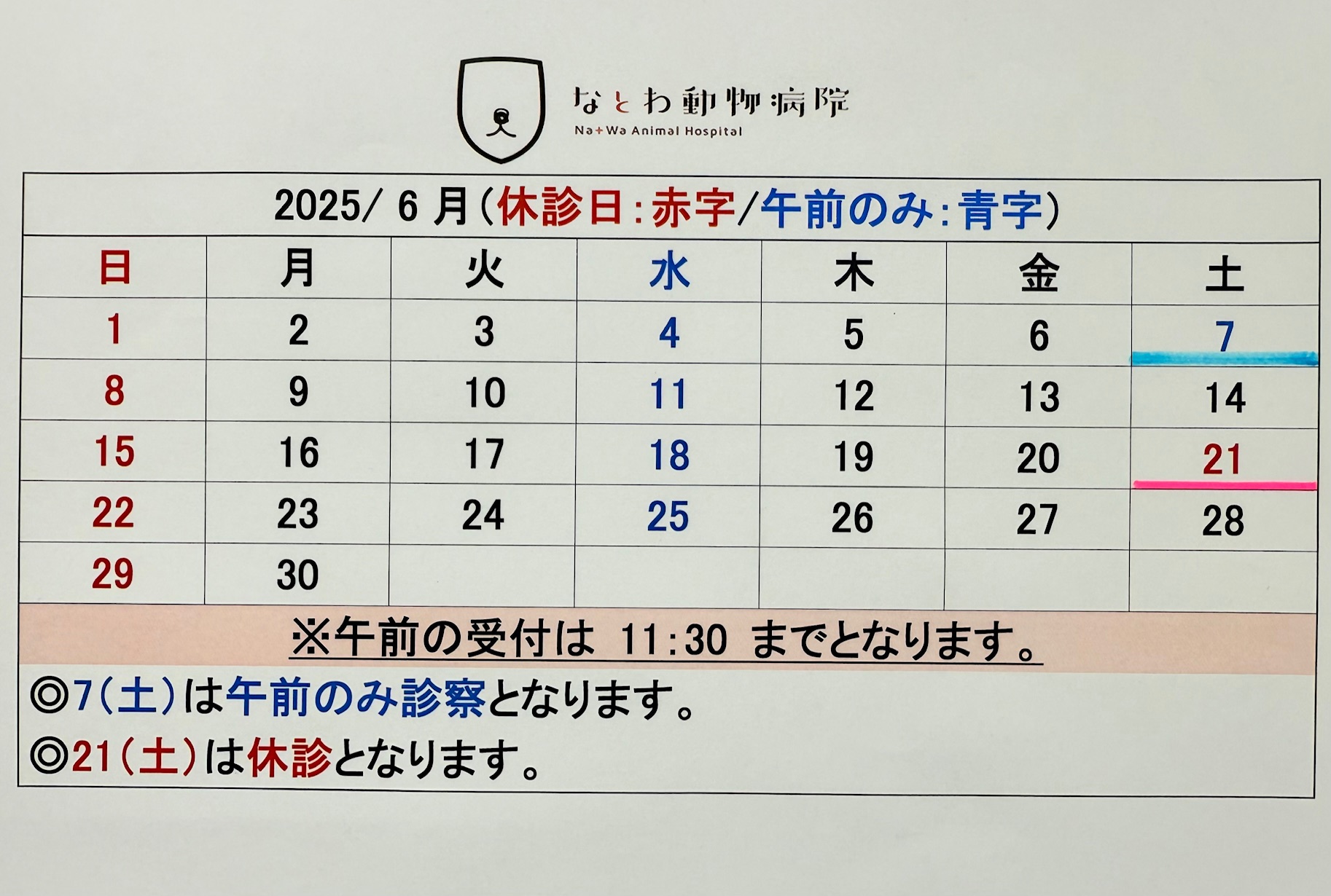 6/7(土)は院長不在のため午前のみの診察となっております。